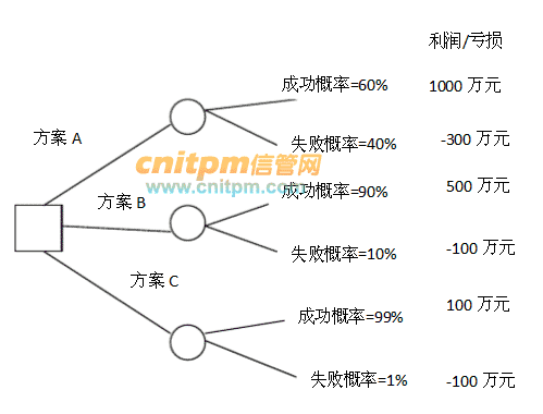 小王是某企业信息化工程师,现在负责实施企业的MES (Manufacturing ExecutionSystem,生产执行系统)项目,有三种实施方案可供选择,他将三种方案的风险进行了列举,画出了图8-1所示的决策树。