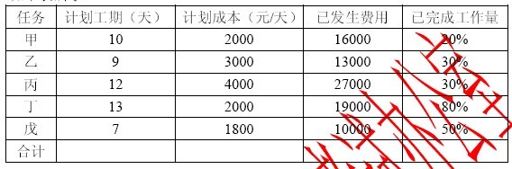 某项目经理将其负责的系统集成项目进行了工作分解,并对每个工作单元进行了成本估算,得到其计划成本。各任务同时开工,开工5 天后项目经理对进度情况进行了考核,如下表所示: