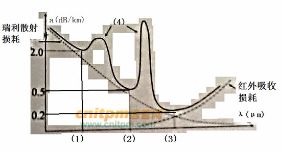 下图为石英光纤的损耗值,其中的三个低损耗波长依次为图中的 (1) 、 (2) 和 (3) ,有两处损耗峰的原因是 (4) 。目前,DWDM传输最常用的是 (5) 波段,对应于 (6) 微米窗口。常规单模光纤(G.652光纤)的零色散波长在 (7) 微米附近, 而色散位移光纤(G.653)的零色散波长移到了 (8) 微米附近。