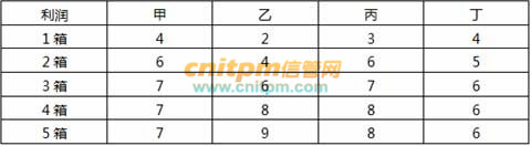 某批发站准备向甲、乙、丙、丁四家小商店供应5箱商品。批发站能取得的利润(单位:百元)与分配的箱数有关(见下表)。批发站为取得最大总利润,应分配__( )__。A. 给甲、丙各1箱 B. 给乙2箱C. 给丙2箱 D. 给丁2箱