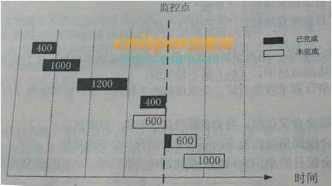假设某项目任务已进行了充分细化分解,任务安排及完成情况如下图,已获价值适用50/50规则(活动开始执行即获得一半价值),则下图中项目监控点的PV、EV、BAC分别为() A、PV=4200 EV=3000 BAC=5200 B、PV=4200 EV=3300 BAC=4600 C、PV=3600 EV=3300 BAC=5200 D、PV=3600 EV=3600 BAC=4600