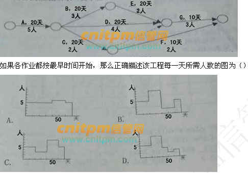 某信息系统集成项目包括7个作业(A~G),各作业所需的时间、人数以及各作业之间的衔接关系如图所示(其中虚线表示不消耗资源的虚作业) A. AB. BC. CD. D