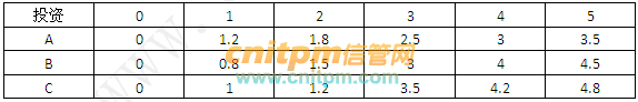 某公司拟将5百万元资金投放下属A、B、C三个子公司(以百万元的倍数分配投资),各子公司获得部分投资后的收益如下表所示(以百万元为单位)。该公司投资的总收益至多为()百万元。 A、4.8B、5.3C、5.4D、5.5