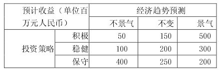 某公司需要根据下一年度宏观经济的增长趋势预测决定投资策略。宏观经济增长趋势有不景气、不变和景气3 种,投资策略有积极、稳健和保守3 种,各种状态收益如下表所示。基于maxmin 悲观准则的最佳决策是( )。