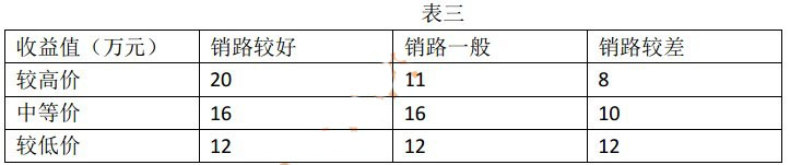 某企业开发了一种新产品,拟定的价格方案有三种:较高价、中等价、较低价,估计这种产品的销售状态也有三种:销路较好、销路一般、销路较差。根据以往的销售经验,他们算出。这三种价格方案在三种销路状态下的收益值如表3所示: