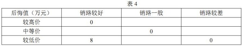 企业一旦选择了某种决策方案,在同样的销路状态下,可能会产生后悔值(即所选决策方案产生的收益与最佳决策收益值的差值)。例如,如果选择较低价决策,在销路较好时,后悔值就为8万元。因此,可以根据上述收益值表制作后悔值如表4所示(空缺部分有待计算)。