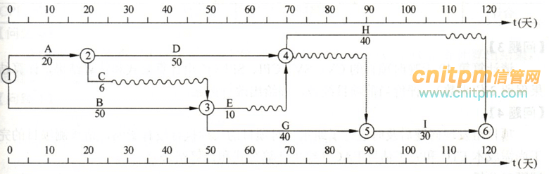 已知某信息工程项目由ABCDEGHI八个活动构成,项目工期要求为100天。项目组根据初步历时估算、各活动间逻辑关系得出的初步进度计划网络图如下图所示(箭线下方为活动历时)。