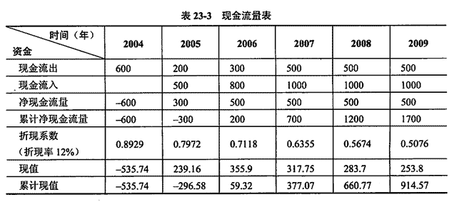 (3)根据上述数据,假设项目成本与收入均在年末核算,通过分析计算该公司从项目开始当年到第6年的现金流量情况,包括每年的现金流出、现金流入、净现金流量、累计净现金流量、现值和累计现值,如表23-3所示。