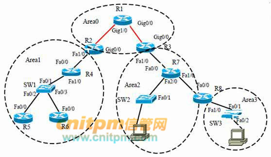 在Area 1中,路由器R4、R5和R6通过一台交换机构成的广播局域网络互连,各路由器ID由路由器的loopback接口地址指定,如指定R4是指派路由器( Designated Routers,DR)、R5为备份的指派路由器( Backup DesignatedRouter, BDR),而R6不参与指派路由器的选择过程。