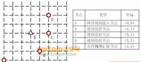 运营商网络中的某个网络视频接入节点,需要通过台交换机实现三个监控点摄像机的视频图像接入,摄像机和交换机之间采用光纤进行互连,并存在个光纤物理汇接节点(用于实现光纤的焙接配置)。备节点的类型、分布和位置坐标如图1 2所示,允许采用2芯、4芯、8芯或1 6芯的光缆。请指出采用“网络节点至监控点直埋光纤”、“通过光纤汇接点汇接光纤”、“基于EPON分光器互连光纤”三种方式需要埋设的光缆类型并计算所需每种类型光缆的最短长度。(注:在计算长度时,√n接可在计算结果十出现。)