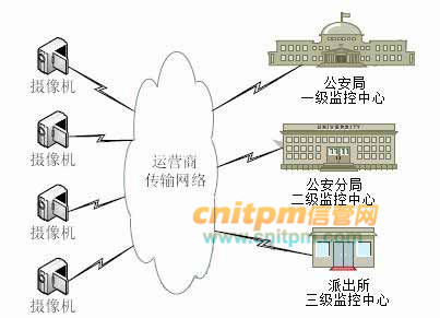 所有监控点的摄像机通过运营商提供的线路接入平安城市网络,公安局的监控体系有三级构成,分别为市局、分局和派出所监控中心。