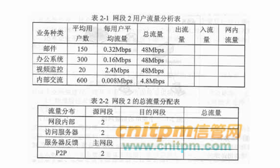 假定条件如下: 网段1、2、3大致相同,不考虑协议封装的开销。 用户收发邮件量大体相同。 内部交流属于用户之间的P2P流量,80%的流量发生在网段内部用户之间,20%的流量发生在不同网段的用户之间,且平均分配流量。 办公系统均为用户访问服务器,按上、下行不对称的一般原则分配流量。 视频监控流量按用户比例在不同网段之间平均分配,属于P2P流量。请根据表2-1中已有的信息将出流量、入流量和网内流量填写完整;将表2-2的目的网段和总流量填写完整。