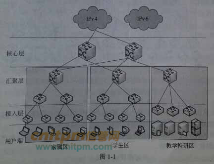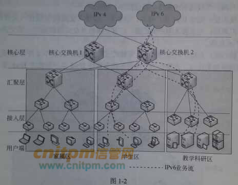 (3) 核心层:是整个网络的核心〈机架式三层交换机, [1 前不支持IPv6 业务) , 同时连接外部网络的出口,是整个园区业务流量通往IPV4主干网的必经之路。