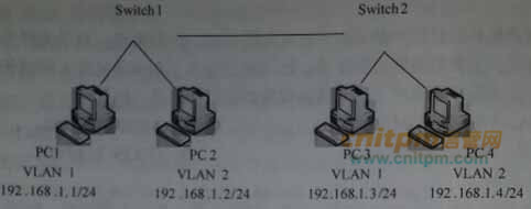 如图所示网络结构,当Switch 1和Switch 2都采用默认配置,那么PC2和PC4之间不能通信,其最可能的原因是(1)上。如果要解决此问题,最快捷的解决方法是(2)。