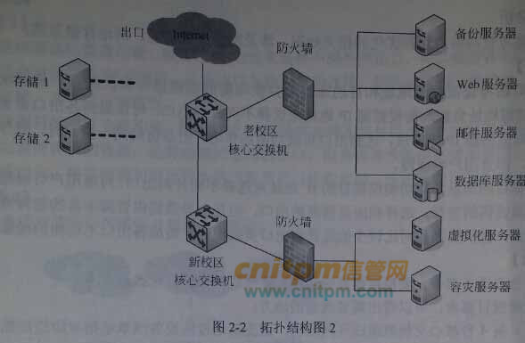 某高校校园网使用3个出口,新老校区用户均通过老校区出口访问互联网,其中新老校区距离20公里,拓扑结构如图2-1所示,学校服务器区网络拓扑结构如图2-2所示。