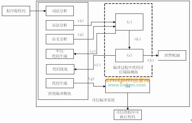 交叉编译器是嵌入式软件开发必备的基础工具软件之一。目前比较流行的交叉编译器是GNU系列产品,它是一种开源软件。编译器生成代码正确与否严重影响机载设备的安全,因此,张工在方案中提出对本项目采用的交叉编译器开展可信技术研究。可信编译器包括两方面含义,其一是编译器自身的可信性,即必须保证整个编译操作的可信性,保证编译器在编译过程中不会给编译处理对象带来任何安全问题;其二是必须保证编译器编译所得程序可执行代码的可信,即编译器必须保证,通过其编译生成的程序代码是安全和可靠的。因此,张工提出在传统编译操作的基础上加入代码安全性加强机制、代码可信性验证机制和可执行代码保护机制。图3-2给出了可信编译系统的框架。
