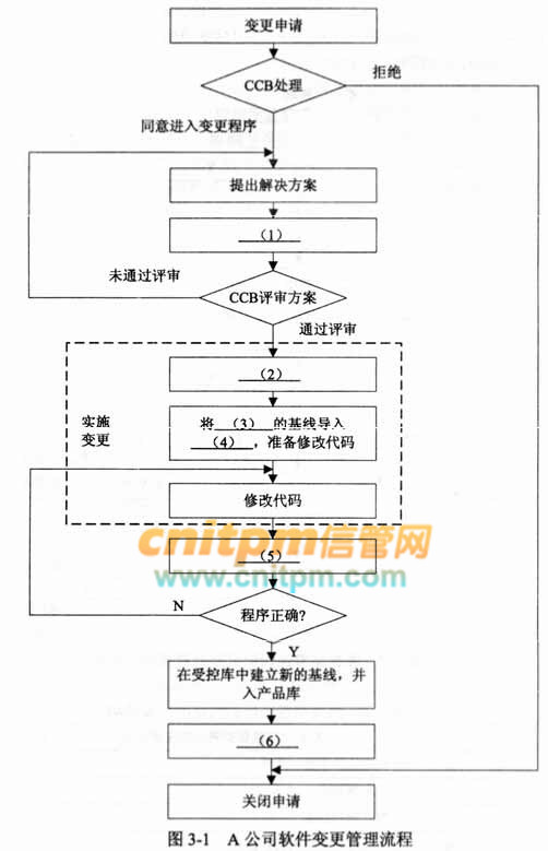 【问题2】(9分) 在开发上述信息处理系统数据管理软件过程中,按照总体设计单位要求,采用开发库、受控库和产品库三库进行软件配置管理,并规定软件产品装机后,该数据管理软件项目在受控库中保存3年。但到发布后第2年时,用户报告了一个bug,经分析,是数据管理软件的一个缺陷。此时,A公司重新调配人员对该数据管理软件进行变更。图3-1是A公司软件变更管理的流程,请从配置管理的角度分析此次变更应开展哪些活动,在图中的(1)到(6)处填写恰当的活动,答案填写在答题纸对应处。