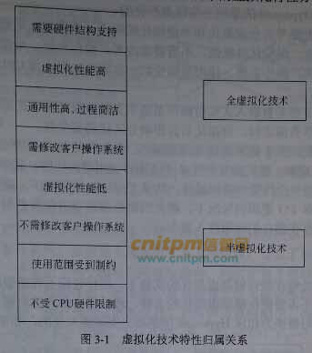 【问题1】(14分) 当前虚拟化的实现技术主要有全虚拟化和半虚拟化两种,请用200字以内的文字说明两种虚拟化技术的主要差别,并用箭线指出图3-1所示的虚拟化特性分属哪种虚拟化技术。