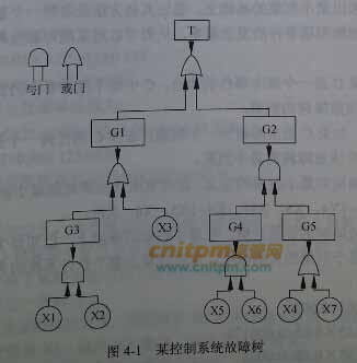 某企业欲研制某宇航控制系统。该系统对软件的可靠性要求很高,分配给软件的可靠性指标为R≥0.99。根据软件结构设计方案,该软件由7个模块X1,X2,„,X7组成,分别完成不同的控制功能。 为了保证该控制系统能够满足环境可靠性指标,李工认为应该首先采用故障树方法分析,预测出可靠性指标。该企业主管采用了李工的建议,建立了该软件的故障树模型(如图4-1所示),评估出了每个模块的可靠性指标,同时在每个模块的设计与实现过程中,采用了流程优化、结构优化、降低设计复杂度等方法来提高模块的可靠性指标。 软件开发完成后,项目组对该软件进行了相应的可靠性测试,得到了各模块的失效概率为:FX1=FX2=0.05,FX3=0.008,FX4=0.07,FX5=FX6=0.05,FX7=0.08,通过计算割集的失效概率来近似计算整个软件的可靠性指标,计算结果表明该软件的可靠性未达到分配的指标要求。