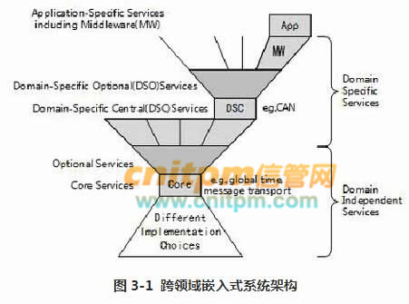 图3-1给出了跨领域嵌入式系统架构,图中CS表示领域无关的核心服务、OS表示领域无关的选择性服务、DSC表示领域相关的中心服务、DSO表示领域相关的选择性服务。该架构通常称为“腰”型架构,将嵌入式系统分为核心服务层、域服务层和应用服务层三个层次,实现了应用间相对无关性设计,架构的腰部为与领域无关的核心服务。