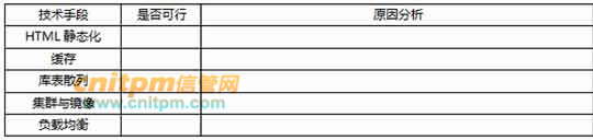 项目组经过集思广益,抽取了HTML静态化、缓存、库表散列、集群与镜像、负载均衡等候选技术手段。请结合需求(2)及相应技术原则,分析上述技术手段在本项目中的可行性,将结果填入表格5-1中。