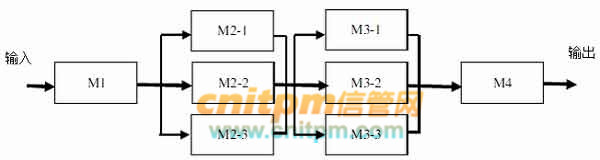 李工认为,应该在软件系统中采用冗余技术中的动态冗余或者软件容错的N版本程序设计技术,对容易失效或者非常重要的模块进行冗余设计,将模块之间的串联结构部分变为并联结构,来提高整个软件系统的可靠性。同时,李工给出了采用动态冗余技术后的软件系统模块示意图,如图5-2所示。