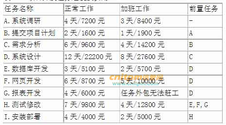 项目组经过讨论后,确定出与项目相关的任务如表2-1所示。其中,根据项目组开发经验,分别给出了正常工作及加班赶工两种情况下所需的时间和费用。