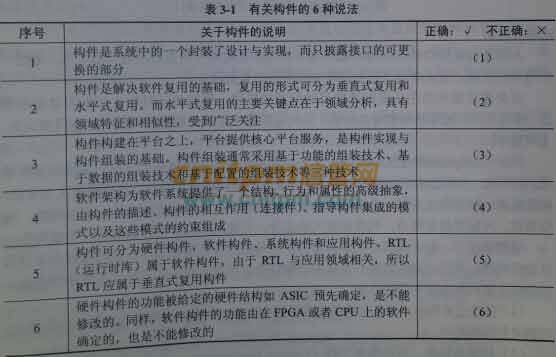 由于该公司已具备大量的成熟软件,王工程师此次的主要工作就是采用遗留工程 (Legacy Engineering)方法,将具有潜在复用价值的软件提取出来,得到可复用的构件。因此,在设计软件时与原开发技术人员产生了重大意见分歧,主要分歧焦点在于大家对构件概念理解上的差异。请根据你对构件的理解,判断下表给出的有关构件的说法是否正确,将答案写在答题纸上。