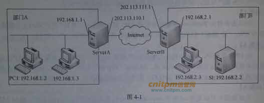 【说明】 某企业在部门A 和部门B 分别搭建了局域网,两局域网通过两台Windows Server 2003 服务器连通,如图 4-1 所示,要求采用IPSec 安全机制,使得部门A 的主机PC1 可以安全访问部门B 的服务器 S1。