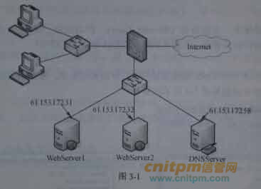 【说明】 网络拓扑结构如图3-1 所示,其中Web 服务器Webserverl 和Webserver2 对应同一域名www.abc.com,DNS 服务器采用Windows Server 2003 操作系统