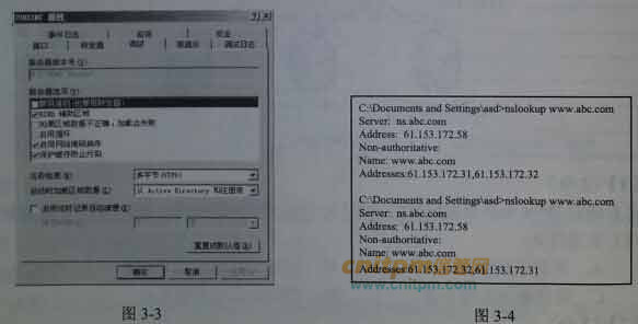 在图3-3 中所示的DNS 服务器属性窗口中应如何配置,才使得两次使用nslookup www.abc.com 命令得到如图3-4 所示结果?