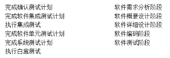 此项目的软件开发模型采用瀑布模型。为了做好质量控制,监理工程师应掌握测试工作进程。在软件生存周期各阶段,测试工作有所不同。请将下面左侧的软件测试活动与右侧对应的软件生存周期阶段用线连接。