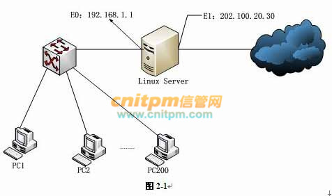 某公司搭建一个小型局域网,局域网内有200台PC机,网络中配置一台linux服务器作为Internet接入服务器,Linux服务器E0网卡的IP地址为192.168.1.1,E1网卡的IP地址为202.100.20.30,该网络结构如图2-1所示。