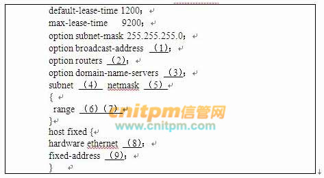 根据题目要求补充完成DHCP服务器配置文件dhcpd.conf的配置项