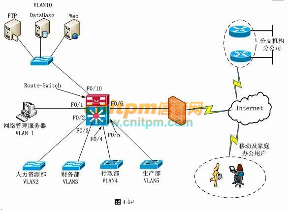 在网络使用中,该企业要求所有部门都可以访问FTP和Web服务器,只有财务部可以访问DataBase服务器;同时,网络管理员可以访问所有络资源,禁止非网络管理员访问交换