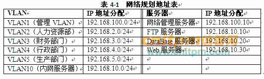 按照网络拓扑结构为该企业网络进行IP地址和VLAN规划,具体规划如表4-1所示。