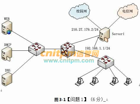 某学校的图书馆电子阅览室已经连接为局域网(局域网段192.168.1.0/24),在原有接入校园网的基础上又租用了—条电信ADSL宽带接入来满足用户的上网需求。其中,校园网网段为 210.27.176.0~210.27.191.255,DNS为210.27.176.3,子网按照C类网络划分,每个子网的网关都为210.27.xxx.1。ADSL宽带的网络地址由电信自动分配。具体网络结构如图3-1所示。