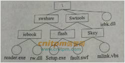 若某文件系统的目录结构如下图所示,假设用户要访问文件fault.Swf,且当前工作目录为swshare,则该文件的全文件名为(1),相对路径和绝对路径分别为(2)。