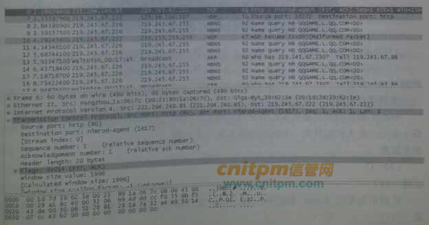 22题: 采用抓包工具截获的结果如下图所示。图中第1行记录显示的是(1),报文由(2)发出。