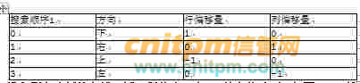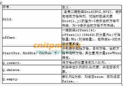 设给定印刷电路板的起始方格x与目的方格y尚未布线,求这两个方格间最短布线方案的基本思路是:从起始方格x开始,先考查距离起始方格距离为1的可达方格并用一个路径长度值标记,然后依次考查距离为2,3,…的可达方格,直到距离为k的某一个可达方格就是目标方格y时为止,或者由于不存在从x到y的布线方案而终止。布线区域中的每一个方格与其相邻的上、下、左、右四个方格之间的距离为1,依次沿下、右、上、左这四个方向考查,并用一个队列记录可达方格的位置。表3-1给出了沿这四个方向前进1步时相对于当前方格的相对偏移量。
