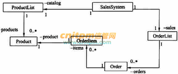 上图中,Product表示产品,ProductList表示产品目录,Order表示产品订单,OrderItem表示产品订单中的一个条目,OrderList表示订单列表,SalesSystem提供订单管理系统的操作接口。