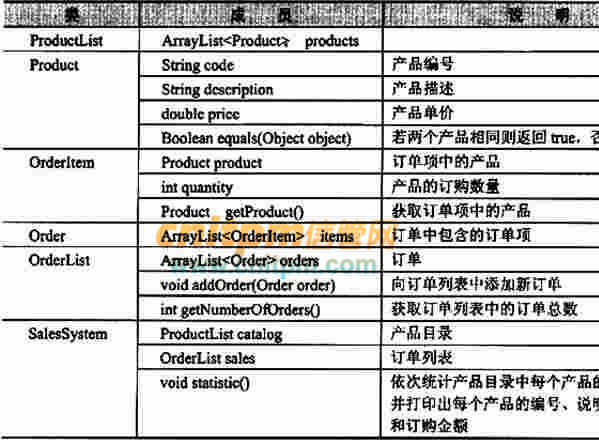 上图中,Product表示产品,ProductList表示所销售产品的列表,Order表示产品订单,Orderltem表示产品订单中的一个条目,OrderList表示订单列表,SalesSystem提供订单管理系统的操作接口。各个类的部分属性和方法说明如下表所示。