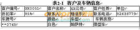 1.对于新客户及车辆,汽车维修管理系统首先登记客户信息,包括:客户编号、客户名称、客户性质(个人、单位)、折扣率、联系人、联系电话等信息;还要记录客户的车辆信息,包括:车牌号、车型、颜色等信息。一个客户至少有一台车。客户及车辆信息如表2-1所示。