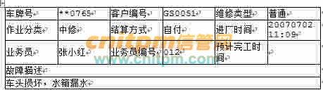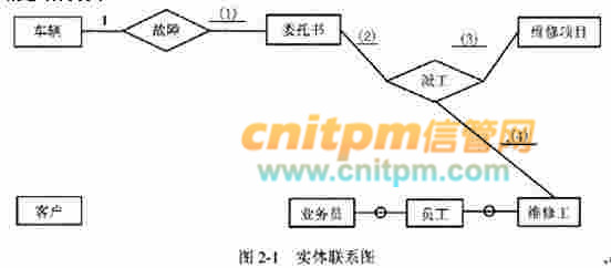 2.记录维修车辆的故障信息。包括:维修类型(普通、加急)、作业分类(大、中、小修)、结算方式(自付、三包、索赔)等信息。维修厂的员工分为:维修员和业务员。车辆维修首先委托给业务员。业务员对车辆进行检查和故障分析后,与客户磋商,确定故障现象,生成维修委托书。如表2-2所示。