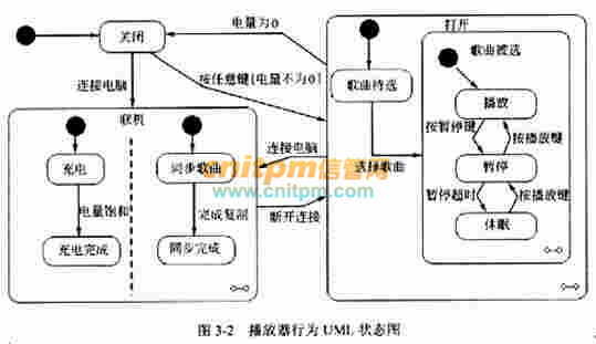 根据图3-2所示的播放器行为UML状态图,给出从“关闭”状态到“播放”状态所经过的最短事件序列(假设电池一开始就是有电的)。