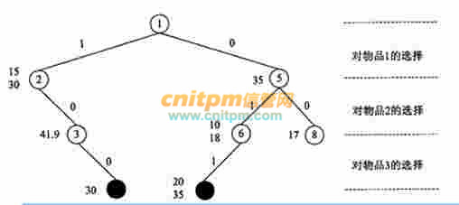 下图是根据上述算法构造的搜索树,其中结点的编号表示了搜索树生成的顺序,边上的数字1/0分别表示选择/不选择对应物品。除了根结点之外,每个左孩子结点旁边的上下两个数字分别表示当前背包的重量和已获得的价值,右孩子结点旁边的数字表示扩展了该结点后最多可能获得的价值。为获得最优解,应该选择物品 (5) ,获得的价值为 (6) 。