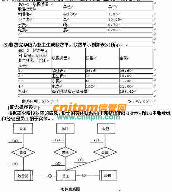 (4)收费信息包括:房号、业主编号、收费日期、收费类型、数量、收费金额、员工号等。收费类型包括物业费、卫生费、水费和电费,并按月收取,收费标准如表2-1所示。其中:物业费=房屋面积(平方米)×每平方米单价,卫生费=套房数量(套)×每套房单价,水费=用水数量(吨)×每吨水单价,电费=用电数量(度)×每度电单价。