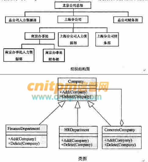其中Company为抽象类,定义了在组织结构图上添加(Add)和删除(Delete)分公司/办事处或者部门的方法接口。类ConcreteCompany表示具体的分公司或者办事处,分公司或办事处下可以设置不同的部门。类HRDepartment和FinanceDepartment分别表示人力资源部和财务部。