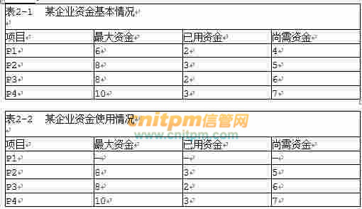 若某企业拥有的总资金数为15,投资4个项目P1、P2、P3、P4,各项目需要的最大资金数分别是6、8、8、10,企业资金情况如表2-1所示。P1新申请2个资金,P2新申请1个资金,若企业资金管理处为项目P1和P2分配新申请的资金,则P1、P2、P3、P4尚需的资金数分别为(1);假设P1已经还清所有投资款,企业资金使用情况如表2-2所示,那么企业的可用资金数为(2)。若在表2-2所示的情况下,企业资金管理处为P2、P3、P4各分配资金数2、2、3,则分配后P2、P3、P4已用资金数分别为(3)。