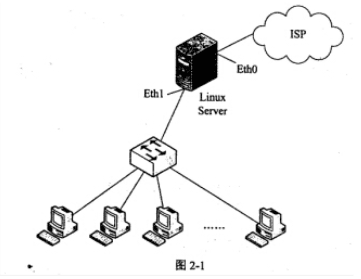 某公司内部搭建了一个小型的局域网,拓扑图如图2-1所示。公司内部拥有主机约120台,用C类地址段192.168.100.0/24.采用一台Linux服务器作为接入服务器,服务器内部局域网接口地址为192 198 100 254,ISP提供的地址为202.202.212.62.